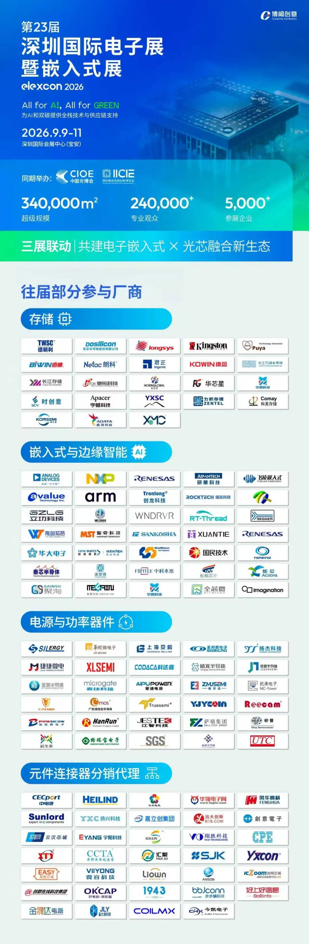2026深圳,elexcon深圳国际电子展暨嵌入式展与CIOE中国光博会、IC创新博览会将于9月9日正式开启“三展联动”,以34万㎡超大规模、5000+展商矩阵、24万+专业观众,打造“电子嵌入式×光芯”一站式产业生态平台。